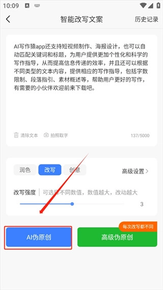 2、选择好了之后点击进入,将自己需要改写的内容复制进去,点击“ai伪原创”按钮。