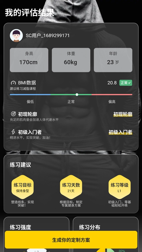 6、基于以上所有数据,硬汗健身将通过智能解析,最终生成一份专属于你的评估结果,并据此进一步定制个性化方案。