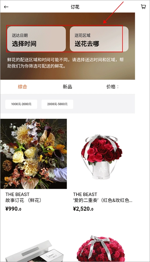 2、进入订花页面,选择送达时间和区域,然后选花;