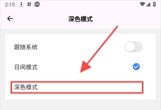3、在深色模式界面中,有跟随系统、日间模式、深色模式三个选项,点击深色模式就能完成设置。