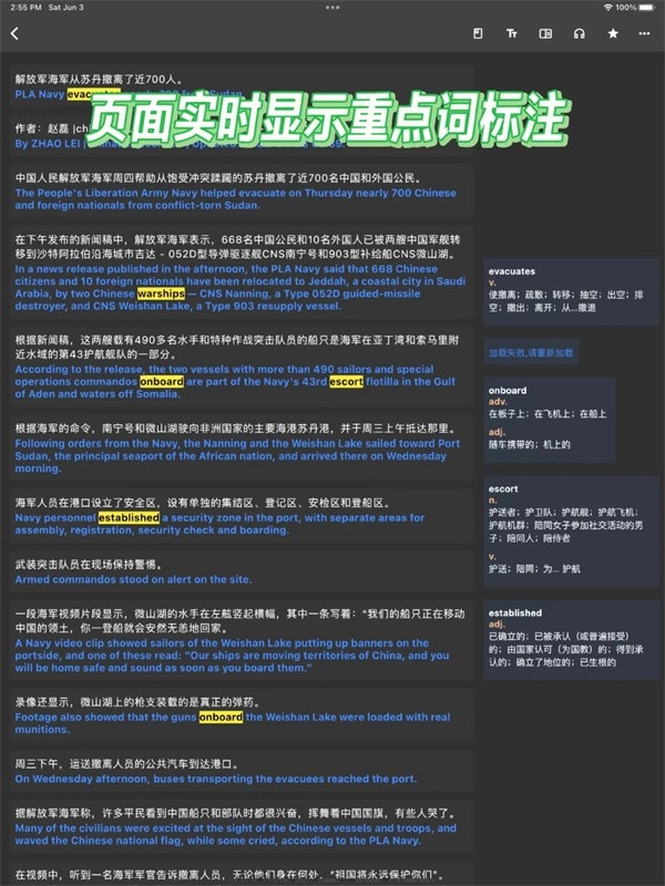 8、阅读过程中,长按划词或单击单词均可实现翻译功能;会员用户还能享受单词收藏和高亮显示的权益。