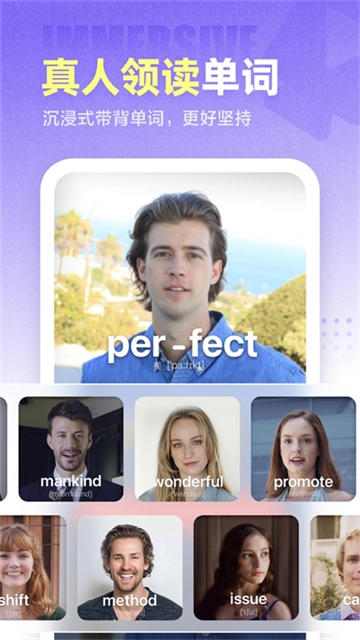 1、每个单词都配备了专属教学视频,采用实景领读模式——由好莱坞演员在北美地标场景中,手把手示范地道发音技巧,引导你模仿标准口型,并对单词进行分音节拆解教学。