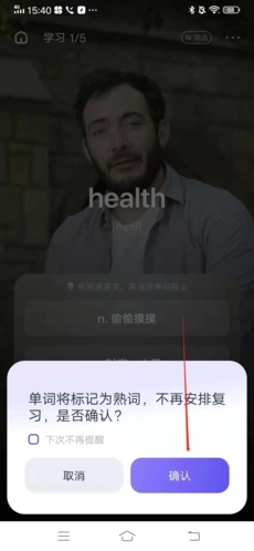 进入后,点击单词左下方的“熟”字,待弹出窗口出现后选择“确认”,即可将该单词标记为已掌握。