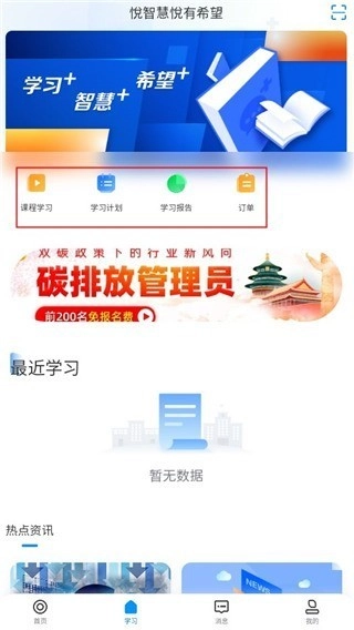 4、在学习页面,查看个人课程、学习计划和报告等信息。