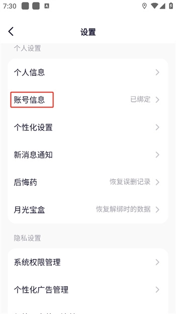 3、进入设置界面后,在此处继续点击【账号信息】选项,进入个人账号信息页面。
