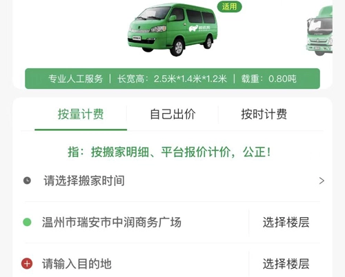 ③厢式货车:载重上限1.8吨;车身尺寸为长4.2米、宽1.8米、高1.8米;运输距离在5公里及以内时,基础车费为149元;超出5公里的部分,按每公里5元加收费用。若用户需人工搬运服务,收费标准为每40分钟100元;装货与卸货环节合计提供60分钟免费等候时间,超出该时长后,每10分钟额外加收25元。