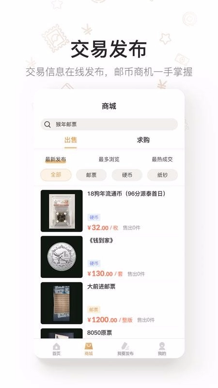 需要求购或是出售手中的钱币或是邮票可以在我要发布中去发布信息;
