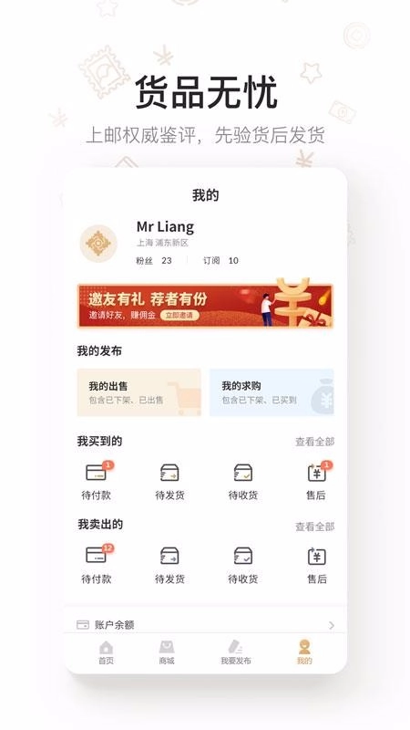 拼上邮是上邮中心推出的邮币交易服务平台,也是一款专注邮票交易的应用。在平台内选购邮票时,可通过第三方支付平台直接在线完成支付;平台为交易双方提供安全可靠的邮币、钱币交易结算服务,让用户无需再像过去那样先在线查询再到线下门店购买,而是能直接在线挑选心仪邮票并完成购买。使用拼上邮手机端,不仅查询和购买更加便捷,操作界面也简洁明了,还能获取更详细的信息,帮助用户清晰了解各类内容。快来下载拼上邮安卓版,查询邮票信息并在线购买吧!