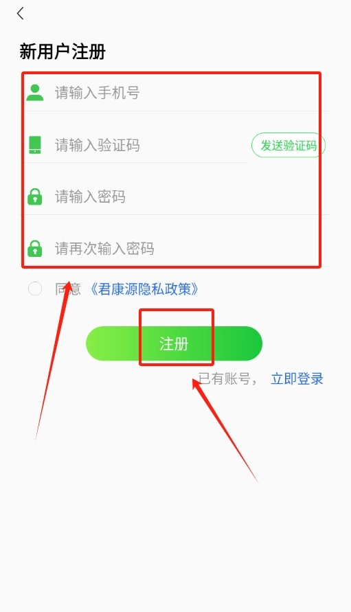 3、新用户注册时输入手机号获取验证码,填写验证码后设置密码即可完成账号注册流程。