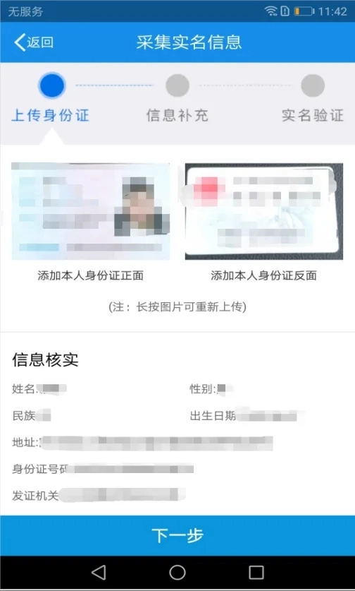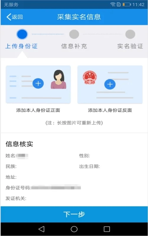 5.点击“+”按钮拍摄身份证照片。拍摄时请尽量保证画面清晰,否则可能会造成身份比对无法通过。