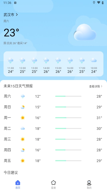3.在应用的主界面,您能查看当前城市的天气情况,像温度、湿度、风力风向这类信息都包含在内。