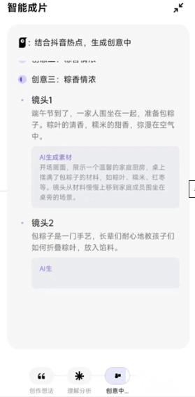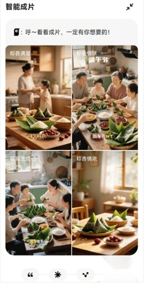1、点击“智能成片”功能选项,接着在弹出的对话框里填写你希望创作的内容主题,像“端午节一家人包粽子”这样的表述就可以。