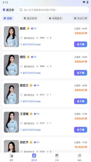 4、跳转页面后,挑选你心仪的技师,点击右侧的“去下单”按钮,就能完成下单流程。