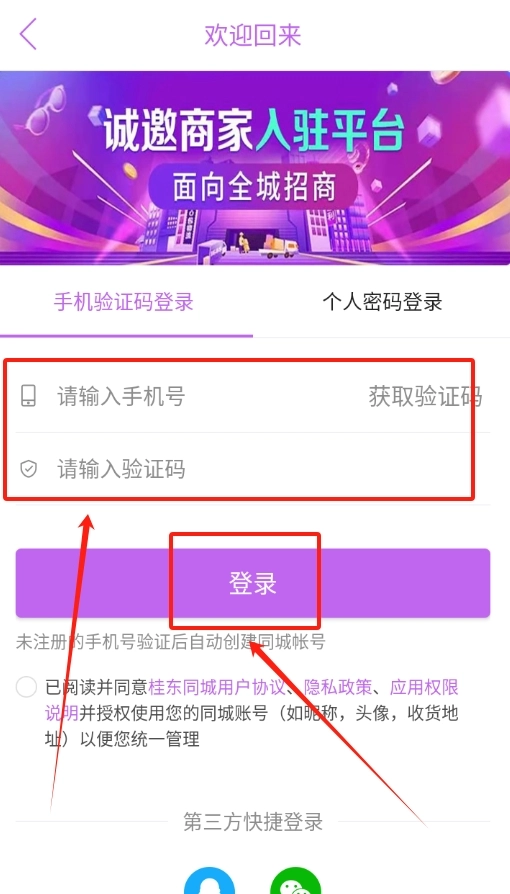 2、在登录页面输入常用的手机号码等待验证码,把短信收到的六位数字准确填入验证框内。