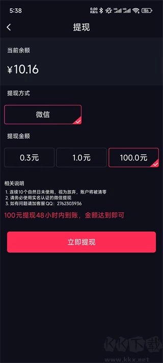 3、选择要提现的金额后点击立即提现按钮(1元提现需连续签到满3天,100元提现会在48小时内到账,满足对应金额条件即可申请)