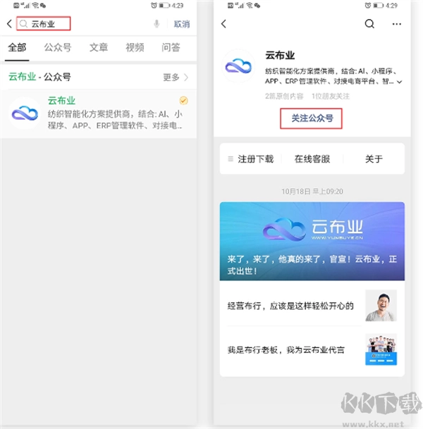 1、打开微信,搜索并关注云布业公众号
