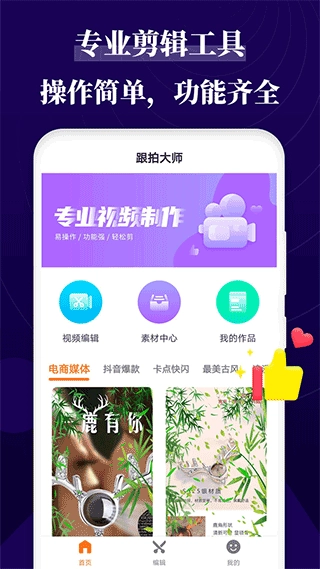如果你正在寻找一款能帮你剪辑视频的工具,不妨试试这款跟拍大师。它是一款功能强大又实用的视频剪辑软件,有了它,你可以随时完成视频制作、添加水印、去除水印、视频同屏、视频倒放、视频拼接等多种操作。而且软件使用起来特别简单,用户能快速上手,轻松处理各类视频。另外,软件内还提供了丰富的背景音乐,可以免费为你的视频配音,用过之后一定会让你满意。可以说,它完全是你视频剪辑的好帮手,还在等什么呢?赶快来体验吧!