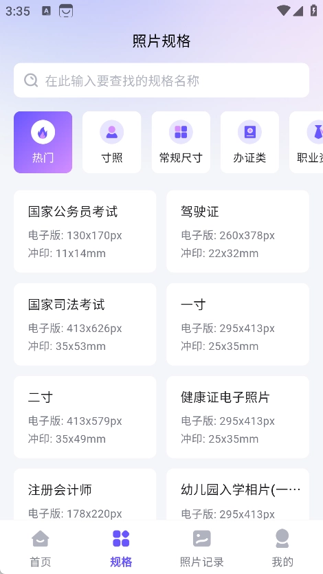 2、规格页面提供了多种不同规格选项,可根据实际需求选择对应的规格来制作证件照。