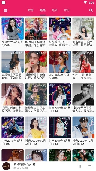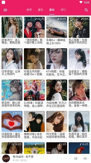 1、打开软件,在导航栏有推荐、最热、最新、排行专区选择,可以进入专区选择想播放的音乐。