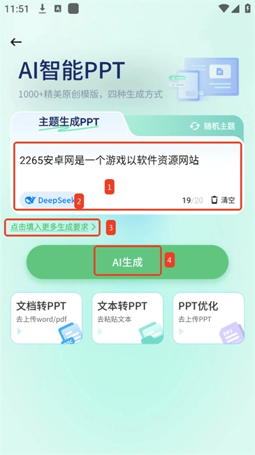 2.输入ppt内容(20字以为),并选择是否需要DeepSeek模块后可根据需要填写更多生成要求,完成上述操作后点击“AI生成”