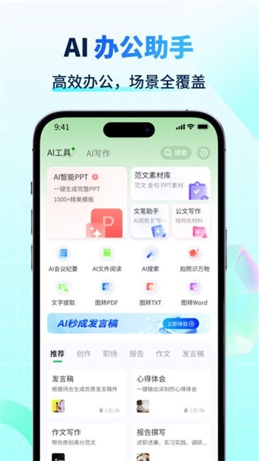 【AI办公】整合了AIPPT、AI智能搜索、文件阅读、录音转字、范文素材库、PDF格式转换、图片提取等多种实用办公工具。
