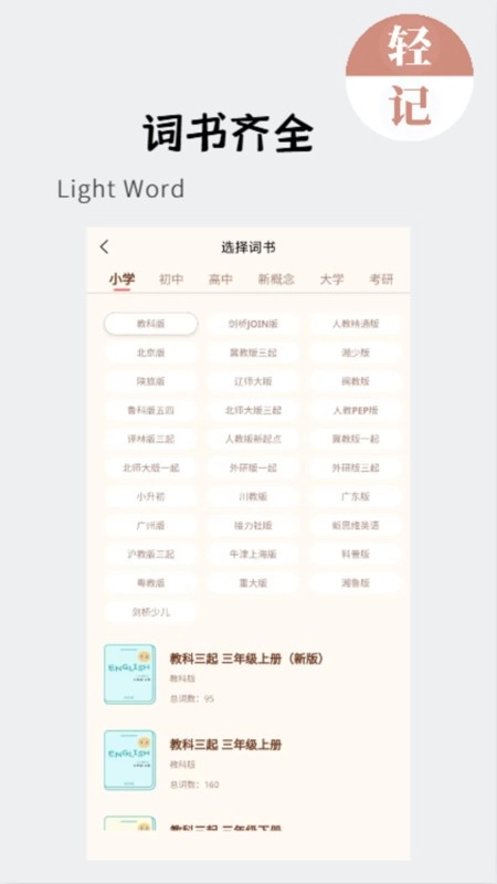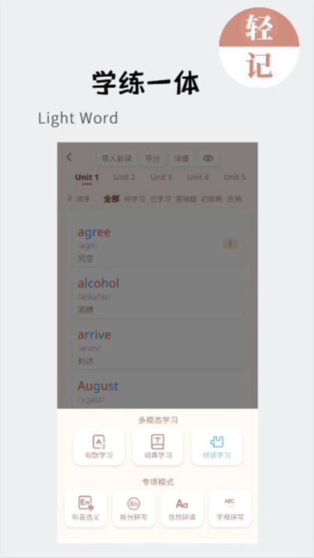 轻记单词的核心功能是帮助用户掌握自然拼读与拆分拼读技巧,让单词记忆更轻松高效。此外,我们还整合了图片联想、词根词缀解析、词源追溯等多元记忆方法,全方位辅助单词学习。复习环节则采用升级版Anki记忆算法,科学强化记忆效果。同时,我们会持续跟进教材更新节奏,确保内容与教学同步。