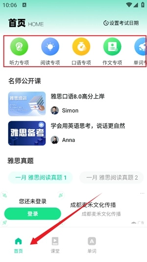 2、主界面精心设计了听力、阅读、口语、写作四大专项训练模块,同时提供单词听力特训和名师精品课程资源。