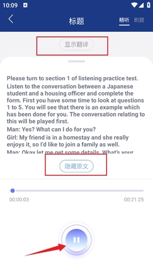 4、训练界面支持双语对照功能,可自由切换原文/译文显示模式,底部播放控制栏可精准调节听力进度。