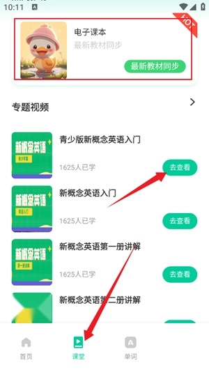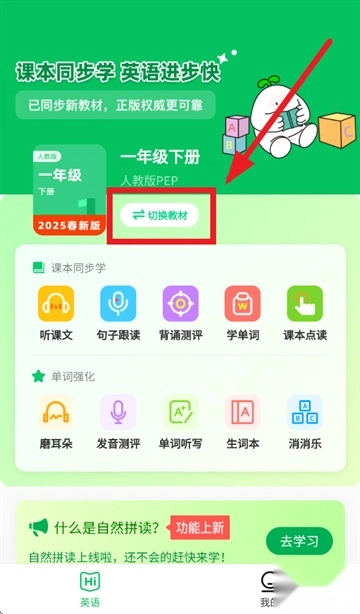 1、用户完成英语朗读宝的安装后,启动应用进入主界面,在英语学习主页找到并点击"切换教材"功能入口。