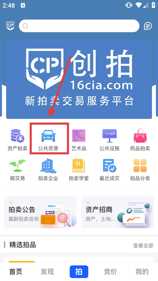 1、在首页点【公共资源】,进入公共资源拍卖列表页。