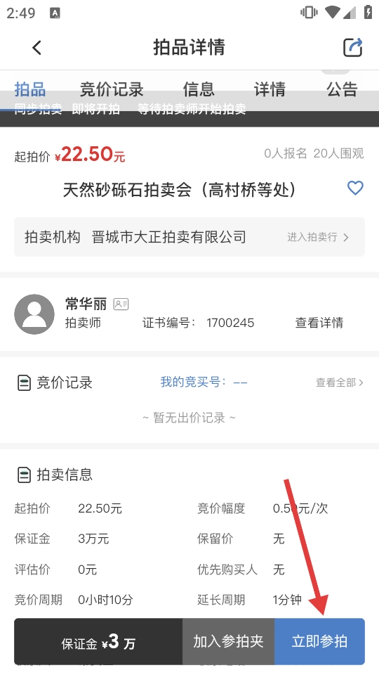 3、在拍品详情页,点【立即参拍】,进入登录页。